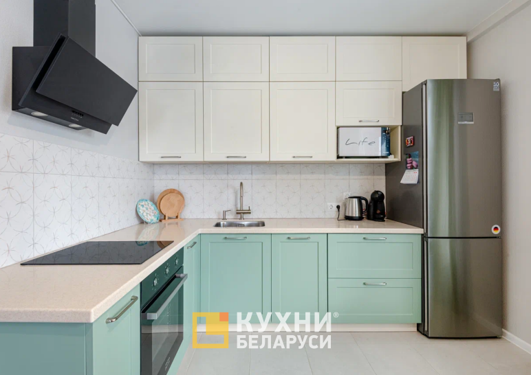 Комплект выполнен в двух цветах: верхний ярус — под цвет слоновой кости, нижний — нежно-мятный. Такие пастельные оттенки в меру добавляют пространству красок и визуально его не нагружают. С той же целью разработан общий дизайн гарнитура. В нем нет ярко выделяющегося декора — только строгие рамочные фасады и ручки-рейлинги. Самый верхний ярус шкафчиков оснащен системой Push to open. Т.е, чтобы открыть дверцу, нужно слегка нажать на нее.